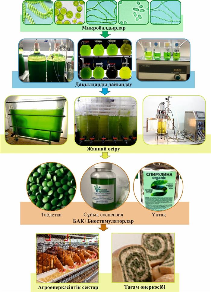 Қазақстан Республикасының тиімді географиялық орналасуы және елімізде күн шуақты күндердің көп болуына байланысты микробалдырлардың биомассасын алу үшін өсірудің салыстырмалы қарапайымдылығы биологиялық белсенді қоспаларды (ББҚ) мен биостимуляторларды алуға арналған өндірістерді дамытуға қолайлы. Мал шаруашылығында микробалдырларды ақуыз, дәрумендер және басқа физиологиялық белсенді заттардың көзі ретінде пайдалану жануарлардың әртүрлі ауруларға, ең алдымен витамин тапшылығына байланысты төзімділігін арттырады, метаболизм процестерін жеделдетеді, осылайша сатылатын өнімдердің көлемі мен сапасын арттыруға ықпал етеді. Бұдан басқа, биопрепараттар, биожемдер және тағамдық биоқоспалар өндіру жөніндегі кәсіпорындарда жаңа жұмыс орындарын құру мүмкіндіктері туралы атап өту қажет.