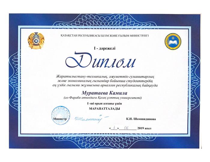 Халықаралық қатынастар факультетінің, Халықаралық қатынастар және әлемдік экономика кафедрасының оқытушысы Исова Лаура Тәңірбергқызының жетекшілігімен халықаралық қатынастар факультетінің студенттері жүлделі орындар алып, I және III деңгейлі дипломдармен марапатталды. Жаратылыстану-техникалык, әлеуметтік-гуманитарлық және экономикалық ғылымдар бойынша студенттердiн ен үздiк ғылыми жұмысына арналған республикалық байқауларда жеңімпаз атанғаны үшін Қазақстан Республикасы білім және ғылым министрлігінің дипломдары берілді.
