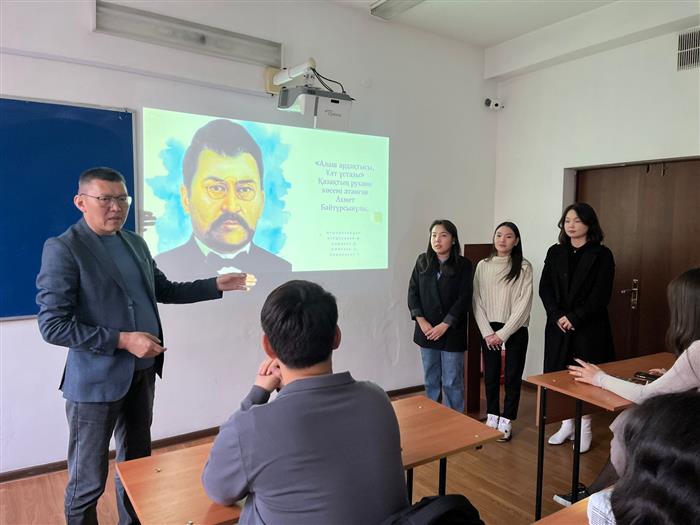 Куратор сағатын өткізген студенттер Олжабек Наргиза, Омирзакова Аружан, Орынбасар Гүлназ, Нурдуллаев Мухит Ахмет Байтұрсынұлы туралы жан-жақты материалдарды слайдта көрсете отырып, көптеген мәліметтер берді. Қазақстан халқы тілдері мерекесі күні қазақ тілінің дамуына өлшеусіз үлес қосқан Ахмет Байтұрсынұлының туған күніне орайластырылып бекітілгенін ерекше айтып өтті.