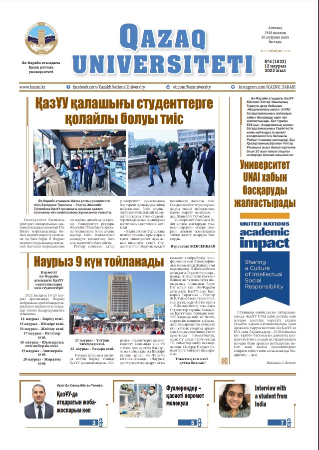 «Qazaq universitetı» газетінің кезекті №6 (1832) саны жарық көрді. Басылымның электронды нұсқасын университет сайтының «Жылдам сілтемелер» бөлімінен оқи аласыздар.