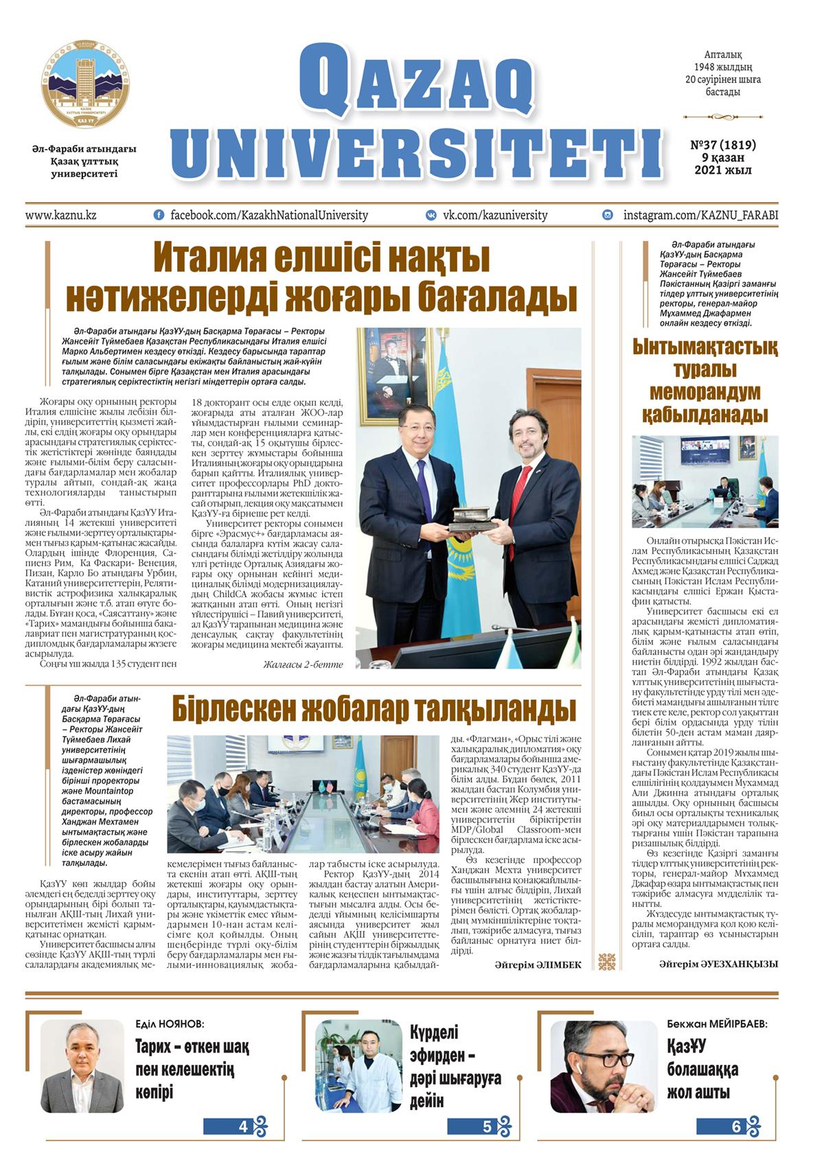 «Qazaq universitetı» газетінің кезекті №37 (1819) саны жарық көрді. Басылымның электронды нұсқасын университет сайтының «Жылдам сілтемелер» бөлімінен оқи аласыздар.