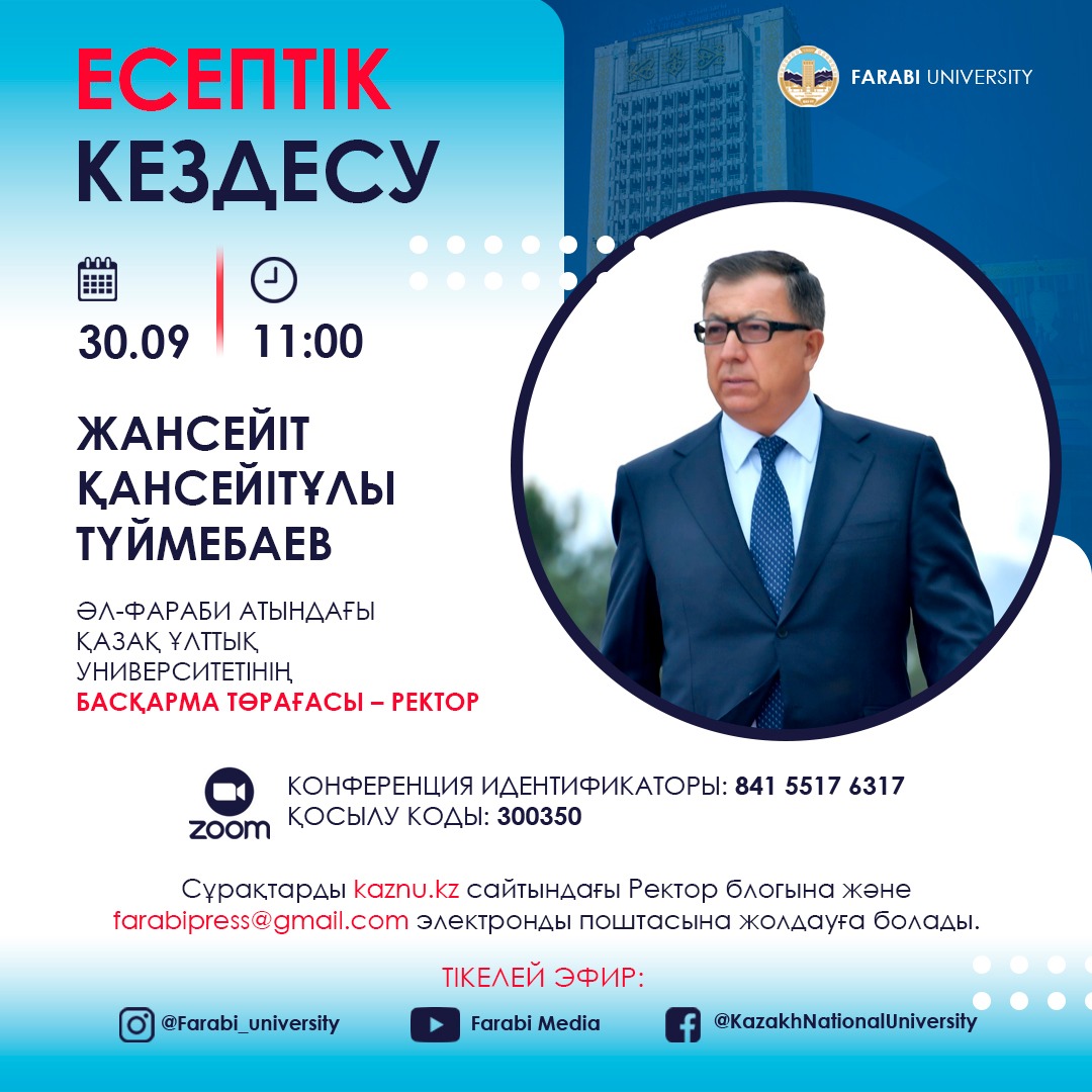 30.09.2021Әл-Фараби атындағы Қазақ ұлттық университетінің Басқарма Төрағасы – Ректоры Жансейіт Қансейітұлы Түймебаев онлайн және офлайн форматта есептік кездесу өткізді. Ректор жоғары оқу орнының білім беру және ғылыми-зерттеу жұмысы, инфрақұрылымын жаңғырту және әлеуметтік мәселелері туралы баяндады. Сондай-ақ 2020/21 оқу жылындағы негізгі нәтижелерді талдап, көшбасшы университеттің алдағы даму жоспарын таныстырды.