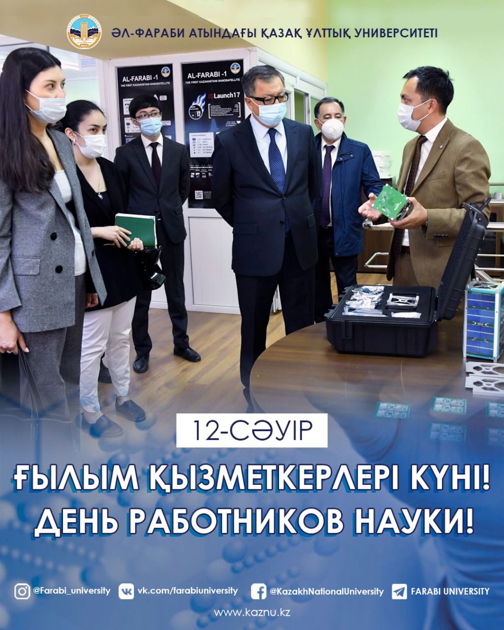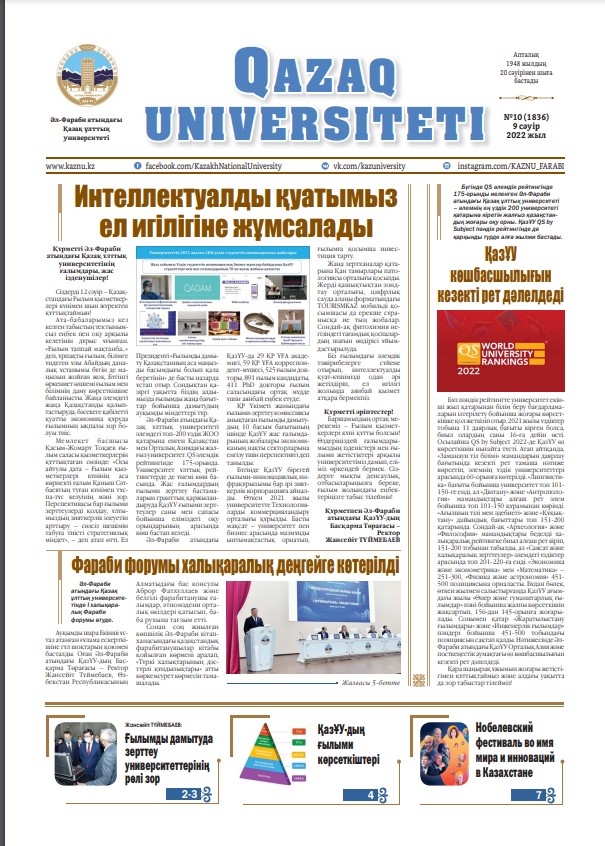 12.04.2022Әл-Фараби атындағы Қазақ ұлттық университетінде Ғылым қызметкерлері күніне арналған салтанатты жиын өтті. Шараға ҚазҰУ-дың Басқарма Төрағасы – Ректор Жансейіт Түймебаев, ҚР Ұлттық ғылым академиясының президенті Мұрат Жұрынов, оқытушы-профессорлар құрамы мен жас ғалымдар қатысты.