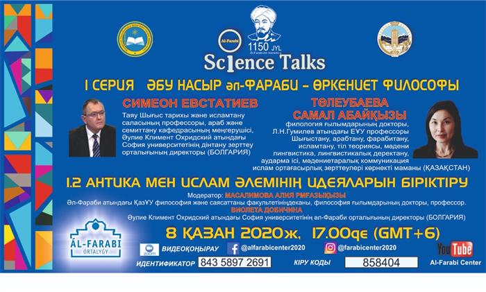 ҚазҰУ жанындағы Әл-Фараби орталығы ҚР Білім және ғылым министрлігінің қолдауымен ұлы ойшылдың 1150-жылдығына, оның шығармашылық мұрасын және қазіргі заманғы адамзат үшін маңыздылығын зерделеуге, сондай-ақ ғылымды дамытудың заманауи мәселелеріне арналған «Science Talks» форматындағы онлайн шаралар сериясын жалғастыруда.