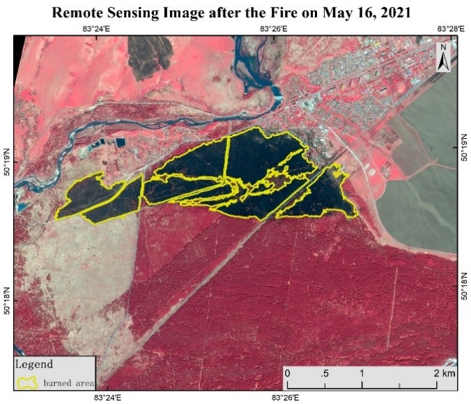 1-кескінде өртке дейін және өрттен кейін 9-шы және 15 мамырдағы суреттер көрсетілген. Орталық мамандары суреттің сары түспен белгіленген тұсы – бұл өртенген аймақ екенін түсіндіріп берді. Ал оның жалпы аумағы 242 гектарға тең. 2-кескін 16 мамырда түсірілген. Ол шартты түспен синтезделген. Бұл суреттегі қызыл аймақ – өсімдік жабыны бар жерлер, ал күйген аймақ қара түспен ерекшеленеді.
