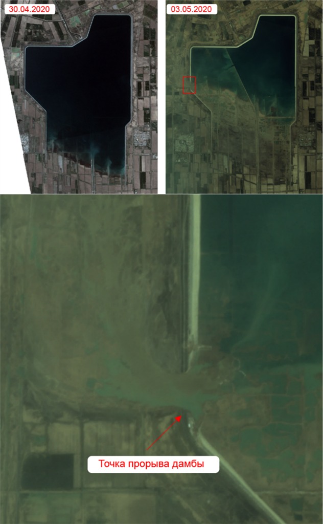 Мамандардың бағалауы бойынша, екі елдегі су басқан аумақтың жалпы ауданы 60 мың гектарды құраған. Оның ішінде 15,2 мың гектар жер Қазақстанға тиесілі территория. Түсірілім кезінде мамандар апатты аймақта екі елдің 24 елді мекені тұрғанын анықтады. Оның жетеуі біздің елде орналасқан. Жер бедерінің ерекшелігіне қарай су ылдилап аққан. Рельефті талдау Қазақстандағы аймақтың еңісте орналасқанын көрсетті. Сол себепті судың үлкен көлемі біздің елді мекендер мен егіс алқаптарына лезде жеткен. Бөгет жарылғаннан кейін судың негізгі бөлігі Қазақстан мен Өзбекстан шекарасындағы ойпатты аймаққа шоғырланып, жеткілікті тереңдікте үлкен су басу аймағы пайда болды. 2020 жылдың 3-4 мамырында түсірілген ғарыштық суреттерде көрсетілгендей, су басқан аумақтардың шекарасы кеңейе түскен. Мұны жер бедеріндегі еңістіктен бөлек, су тасқынына табиғи кедергілер мен үлкен дренаждық арналардың жоқтығымен түсіндіруге болады.