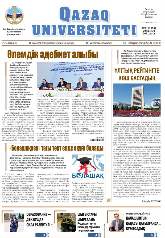 «Қазақ университеті» газетінің кезекті №21 (1803) саны жарық көрді. Басылымның электронды нұсқасын университет сайтының «Жылдам сілтемелер» бөлімінен оқи аласыздар.