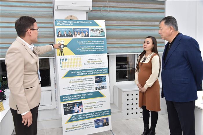 ҚазҰУ басшысы Ж.Түймебаев алдымен «Qazaq universiteti» газеті» басқармасының қызметімен танысты. Биыл қаңтар айында «Qazaq universitеti» газеті республикалық мәртебеге ие болып, «Қазпошта» каталогына енді. Газетке жазылу үшін Halyk bank QR қосымшасы арқылы төлем жасау жүйесі іске қосылды. Қазіргі таңда жазылушылар саны күннен-күнге артып, басылым еліміздің әр өңіріне тарала бастады. Газеттің дизайны түбегейлі өзгертіліп, «Көшбасшылық дәріс», «Кемел», «Инновация», «Білім интеграциясы, «Менің университетім», «Студенттер айнасы» сияқты түрлі жаңа айдарлар ашылды.