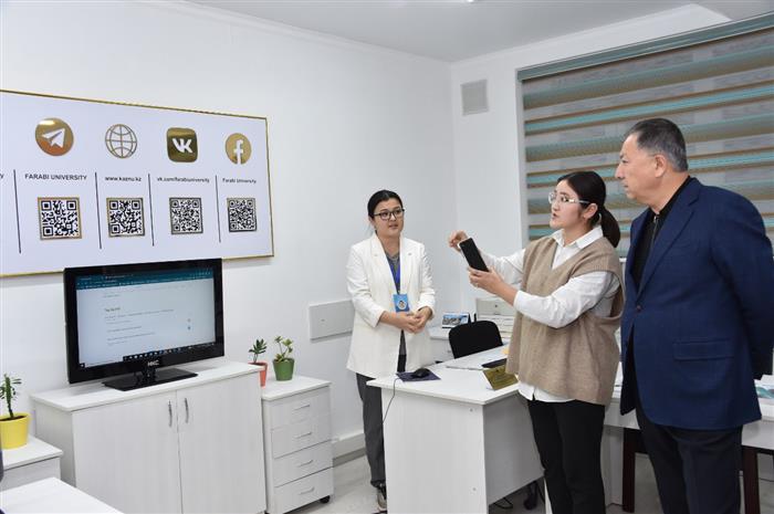 Ректорды Ақпарат және коммуникациялар департаментінің директоры – Баспасөз хатшысы Қаншайым Байдәулет қарсы алып, департамент жұмысы туралы ақпарат берді. Департамент қарамағына төрт басқарма және бір сектор кіреді. Баспасөз қызметі, «Farabi University» сайты, «Farabi Media» телестудиясы, «Qazaq universiteti» газеті басқармалары мен Ақпарат және мониторинг секторы оқу орны басшысының тапсырмасымен қайта жасақталып, ректораттың 3-қабатына орналастырылды. Баспасөз қызметінің телестудиясы құрылып, түсірілім бөлмесі, дыбыс жазу және монтаждау бөлмесі қолдағы бар техникалармен жабдықталып, пайдаланылуға берілді.