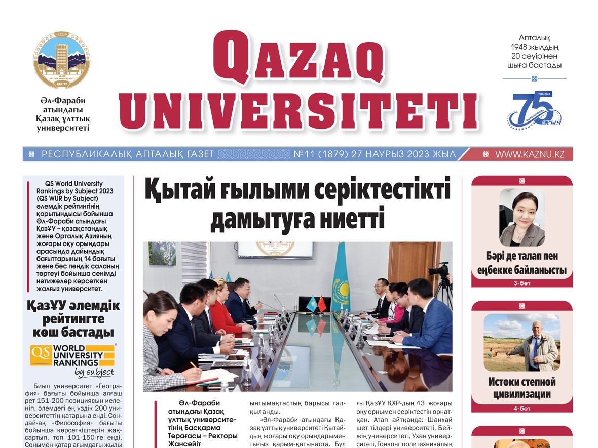 «Qazaq universitetı» газетінің кезекті №11 (1879) саны жарық көрді. Газетте төмендегідей мақалалар, сұхбаттар, ақпараттар жарияланды: