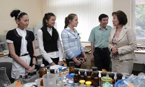 Оқу жұмысы жөніндегі проректоры Мұрат Орынханов жас қонақтарды қарашаңырақ қызметімен таныстырып, университет дипломының шетелде бағаланатындығын, дүниежүзіндегі жетекші ЖОО-мен әріптестік қарым-қатынастарының арқасында студенттер тәжірибе алмасуға мүмкіндіктері барын айтты. «Бізде бәрі қамтылған. Ең алдымен, университеттің бетке ұстар - жоғары білікті оқытушы-ғалымдар құрамы, 14 факультет, колледж, 20 ғылыми-зерттеу институттары, ғылыми кітапхана, республика бойынша жалғыз Студенттер сарайы, әскери кафедра. Сондай-ақ туған жерін, ғылымы мен қарашаңырақ университетін сүйетін, әрі өз шешімін дұрыс санайтын он алты мың студенттер қауымы бар», - деді М. Орынханов оқушылармен әңгімелесе отырып.