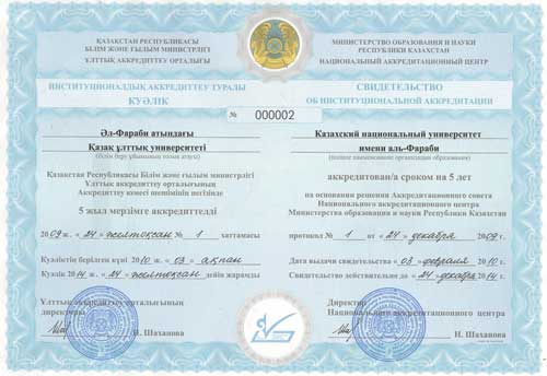 Жақында Қазақстан Республикасы Білім және ғылым министрлігінінің Ұлттық аккредитациялық орталығы тұңғыш рет халықаралық үлгі бойынша жоғарғы оқу орындары аккредитациясының қорытындысын шығарды. Отадық оқу орындарының ішінде ұлттық аккредитацияны әл-Фараби атындағы Қазақ ұлттық университеті алғашқы болып сәтті өтті.
