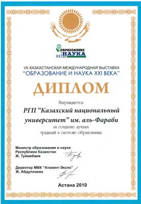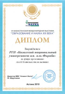 Қазақ ұлттық университеті халықаралық көрмеде сәтті таныстырылды және білім саласында үздік дәстүрді құрғаны үшін және өз қызметін үздік таныстырғаны үшін дипломмен марапатталды.