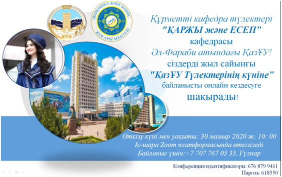 30 мамыр 2020 ж. сағат 10.00 Әл-Фараби атындағы ҚазҰУ, Экономика және бизнес Жоғары мектебінің,"Қаржы және есеп” кафедрасы "ҚазҰУ Түлектерінің күніне” байланысты онлайн кездесу өткізеді. Іс-шара Zoom платформасында өткізіледі Конференция идентификаторы: 676 879 9411 Пароль: 618550