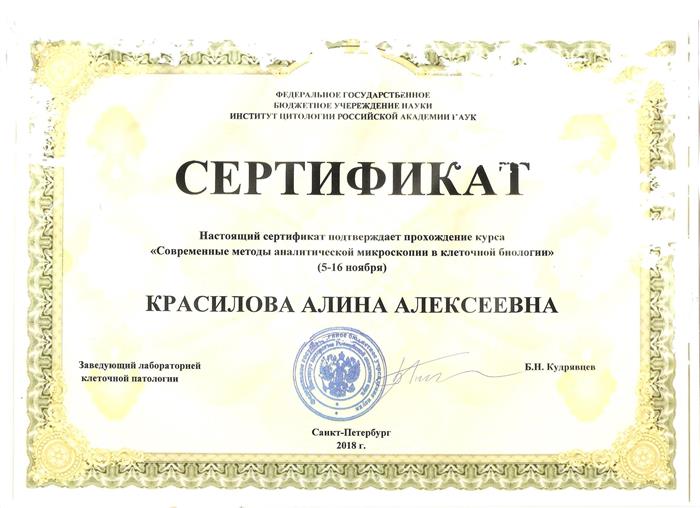 Настоящий сертификат подтверждает прохождение курса «Современные методы аналитической микроскопии в клеточной биологии» |