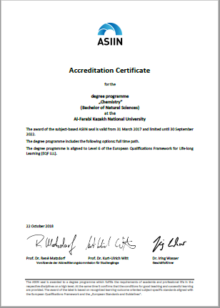 "химия" мамандығы бойынша бакалавриат, магистратура және докторантураның білім беру бағдарламаларын ASIIN (Германия) агенттігі аккредиттеді. |