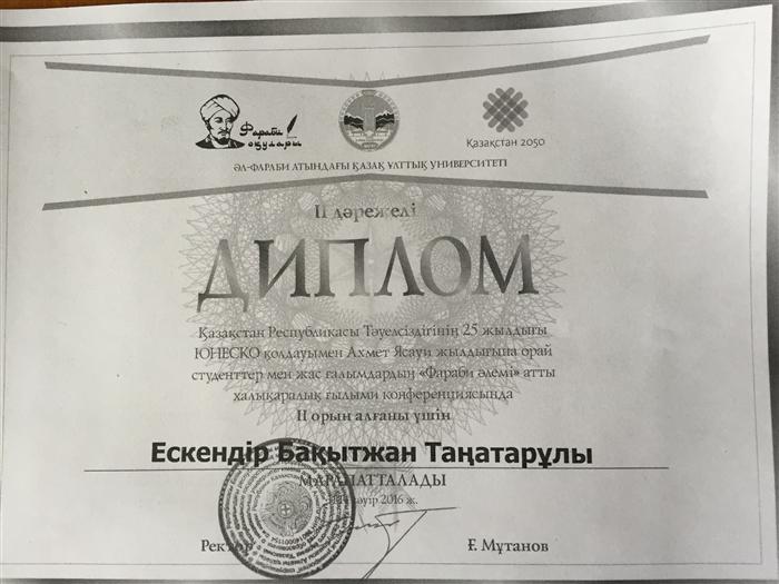 Кафедрамыздың 4-курс студенті Ескендір Бақытжан (ғылыми жетекшісі профессор Аубакиров Е.А.) ҚР тәуелсіздігіне 25 жылдығымен ЮНЕСКО қолдауымен Ахмет Яссауи жылдығына орай студенттер мен жас ғалымдардың "Фараби әлемі" атты халықаралық ғылыми конференциясында 2-орын алып, 30 мың теңге ақшалай сыйлықпен марапатталды. |