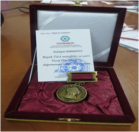 Профессор Қ.Б. Жарықбаев «Халықаралық түрік мәдениеті ассоциациясының» (TURKSOY) төс белгісімен марапатталды (2017). |