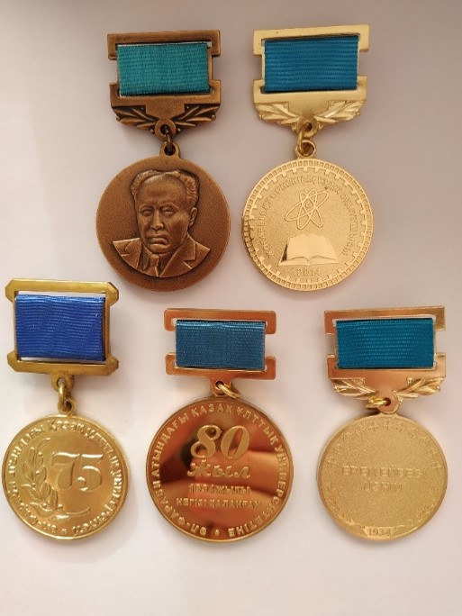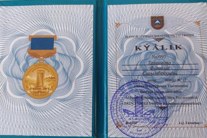 Ташимова Ф.С. университеттің дамуына қосқан үлесі үшін «әл-Фараби атындаы Қазақ ұлттық университетіне 90 жыл» мерекелік төсбелгісімен марапатталды (2024) |