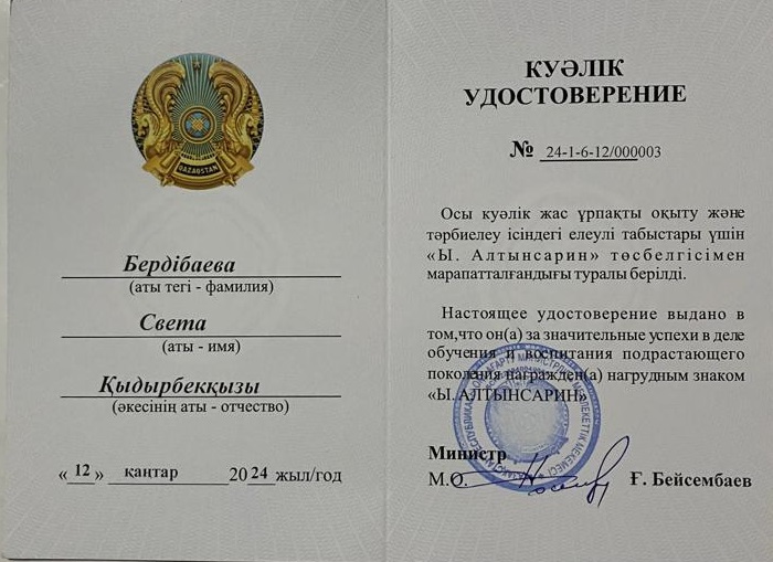 Бердібаева С.Қ. жас ұрпақты оқыту және тәрбиелеу ісіндегі елеулі табыстыры үшін "Ы.Алтынсарин" төсбелгісімен марапатталды (2024) |