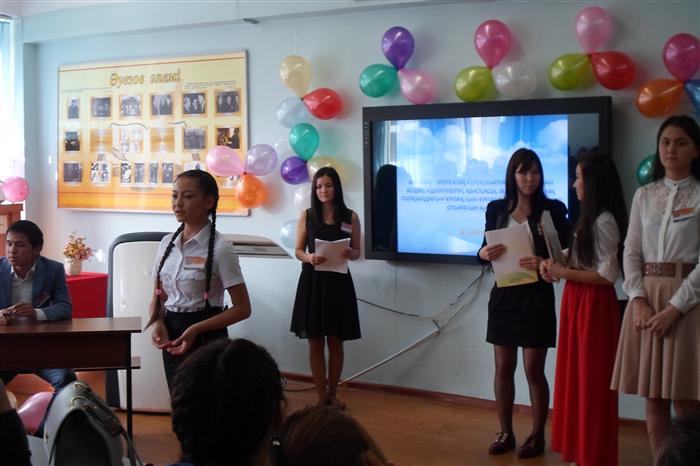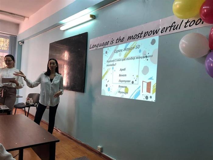 | ТІЛ-АҚЫЛДЫҢ ӨЛШЕМІ Қазақстан республикасының халықтарының тілдер мерекесіне орай, 16 қыркүйек күні әл-Фараби атындағы Қазақ ұлттық университеті филология және әлем тілдері факультетінің шетел филологиясы және аударма ісі кафедрасының профессоры Г.Қ.Қазыбек мен «Аударма ісі» мамандығының 2 курс магистранттары А.Болат, Г.Жалғасбаева, М.Еркіннің ұйымдастыруымен «Тіл мәртебесі-ел мәртебесі» атты зияткерлік сабағын ұйымдастырды |