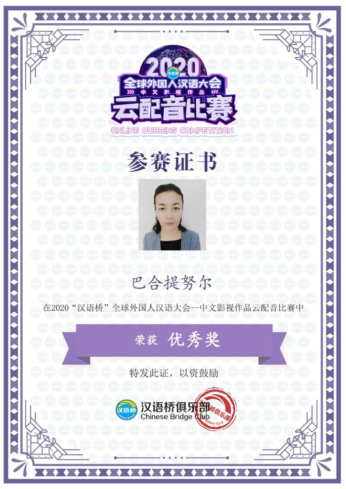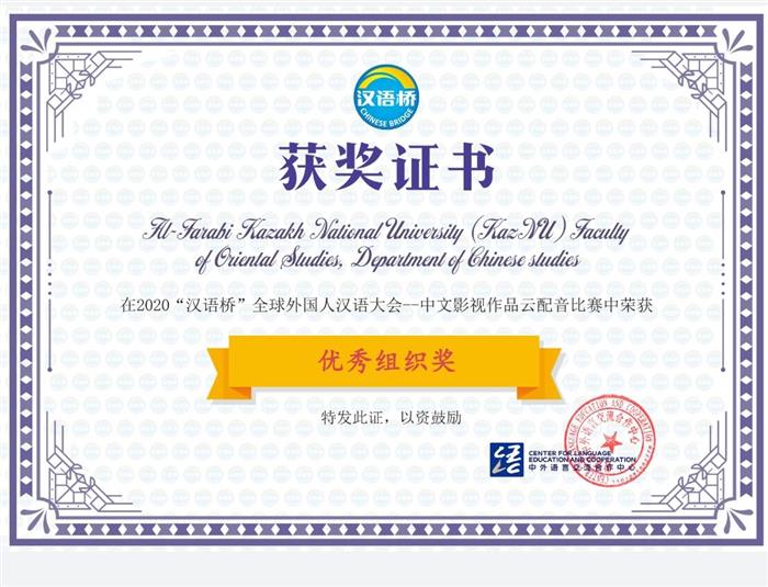 2020 жылдың 30-қарашасы мен 2021 жылдың 20-қаңтар аралығында ҚХР Бейжің қаласында Қытай шет тілдер алмасу орталығы, Орталық радио және телевизиясы, «Қытай тілі көпірі» клубы және Қытай тілі альянсының бірлесіп ұйымдастыруымен шетелдіктер арасында қытай фильмдері мен теледидар туындыларын дубляждау бойынша сайыс ұйымдастырылды. Сондай-ақ, кафедрамыздың 3 жетекші оқытушы, атап айтсақ, Оразақынқызы Фарида, Дүйсенбай Құлпынай және Маулит Бақытнұр «Үздік жетекші» марапатына ие болды. |