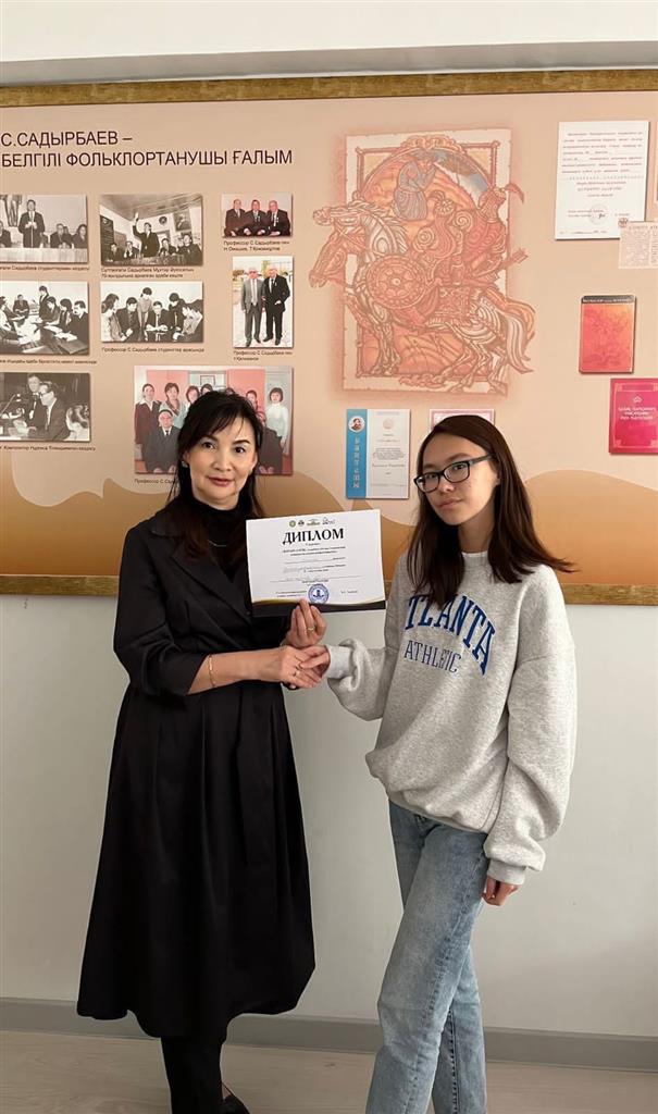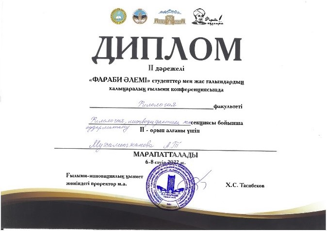 2022 жылдың сәуір айының 06 жұлдызында әл-Фараби атындағы Қазақ ұлттық университетінің «ФАРАБИ ӘЛЕМІ» атты студенттер мен жас ғалымдардың VII халықаралық ғылыми конференциясында «Жас ғалымдар» секциясында ғылыми баяндама жасап, екінші орын иегері болған филология факультеті, «Аударма ісі (батыс тілдері)» мамандығының 1 курс магистранты Муратова Айгерим Муратовна. Баяндама тақырыбы: «Қазақ-өзбек әдеби байланыстары». Ғылыми жетекшісі: Қазыбек Гүлмира Құдайбергенқызы. |