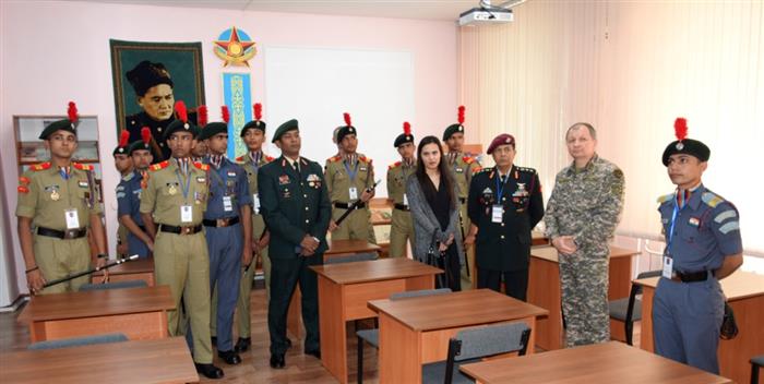 При посещения военной кафедры, индийские кадеты ознакомились с учебно-материальной базой кафедры, побывали на учебных занятиях и прослушали ознакомительную лекцию "85-лет военной кафедре КазНУ имени аль-Фараби". В ходе лекции, начальник военной кафедры полковник запаса Ажимов О.В. рассказал о военной кафедре, достижениях ее выпускников и системе подготовки офицеров запаса в нашей стране.