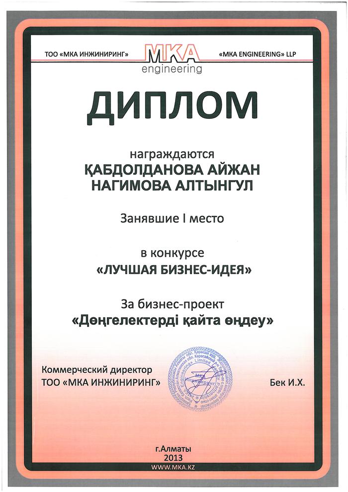 1) Студенты 3 курса Тұнғышпаев Нұрсұлтан и Асылұлы Ерасыл выиграли в номинации «Лучший инновационный проект» в Республиканском форуме «Мен жастарға сенемін!» в ноябре 2016 года 2) Команда из студентов 3 курса (Сағынбаева А., Жақсыгереева А., Тұнғышпаев Н.) получили грамоту в номинации «Лучший научный проект» на Республиканском конкурсе НИРС, проводимой НЭУ им. Т. Рыскулова. Руководитель: PhD, Кондыбаева С.К. 3) Студент 4 курса Қуанышева Мәдина получила грамоту за 2 место на конференции «Фараби әлемі». Руководитель: PhD, Рахматуллаева Д.Ж. 4) Студент 3 курса Сағынбаева Ақтолқын получила грамоту за 3 место на конференции «Фараби әлемі». Руководитель: PhD, Рахматуллаева Д.Ж. 5) Магистрант 2 курса Еркін Назарбай получил грамоту за 2 место на конференции «Фараби әлемі». Руководитель: PhD, Кондыбаева С.К. 6) Магистрант 2 курса Еркін Назарбай получил Диплом в номинации «За лучший научный стиль» в І Международном научном конкурсе молодых ученых «Евразийский мир в научном поиске молодежи» 7 апреля 2017 года |