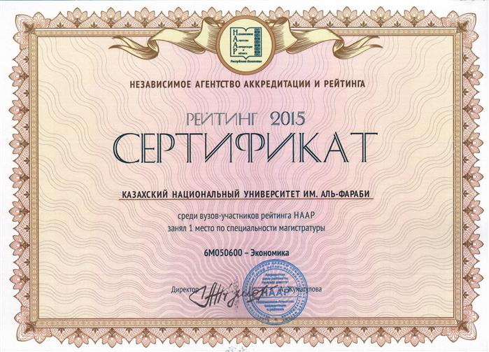 Специальность "Экономика" по результатам независимого рейтингового агентства НАР по всем трем направлениям обучения: бакалавриат, магистратура и докторантура заняла первое место в Республике в 2015 году. Сентябрь 2015 г. |