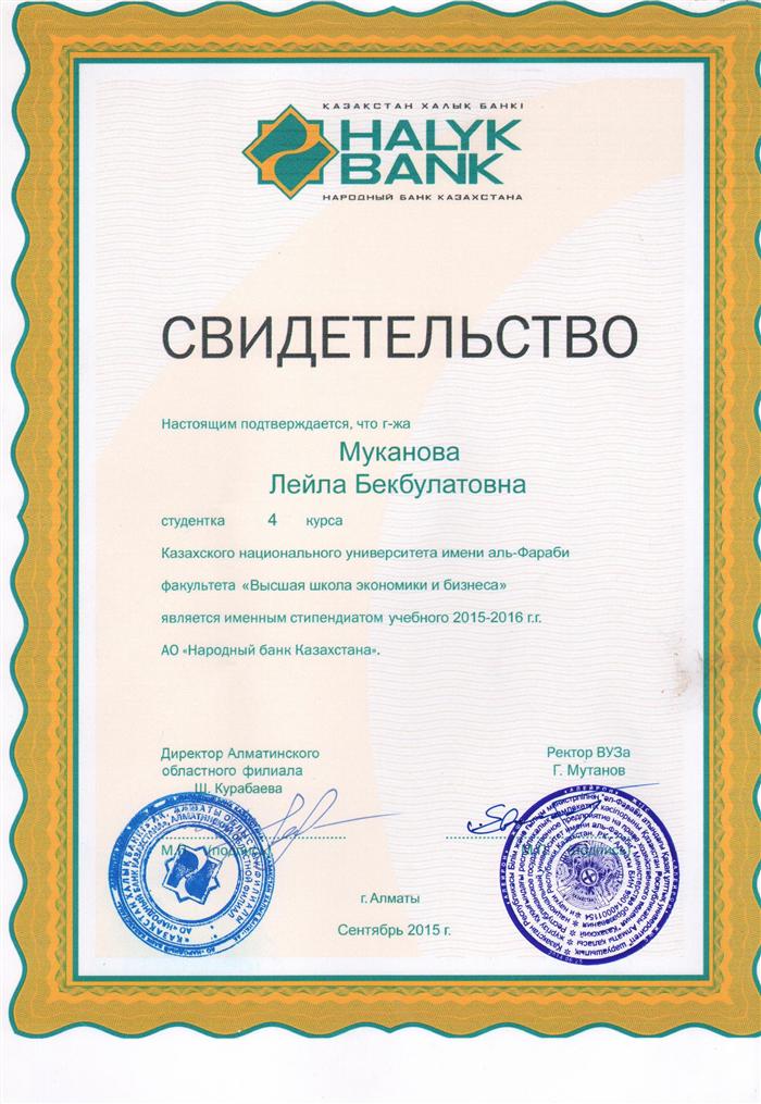 Студентка 4 курса специальности "Экономика" Муканова Лейла является стипендиатом АО "Народного банка Казахстана"