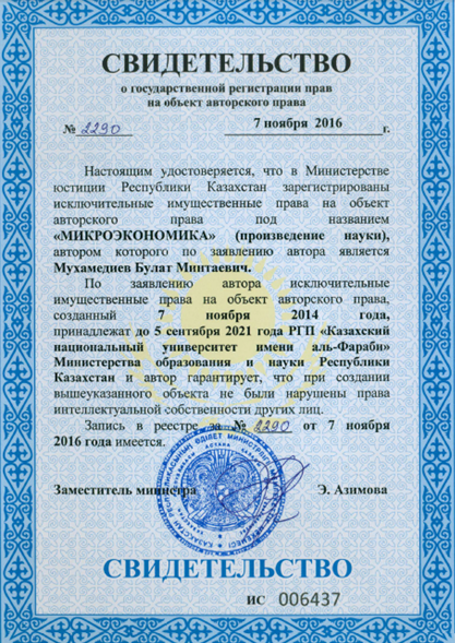 Свидетельство о государственной регистрации прав на объект "Микроэкономика", автором которого является Мухамедиев Б.М. |