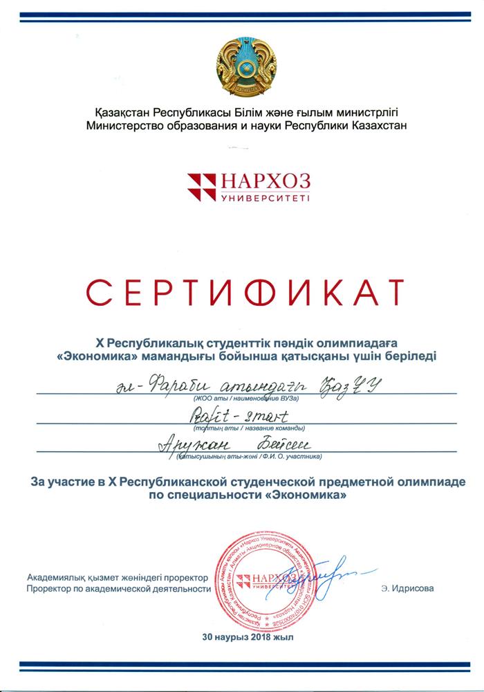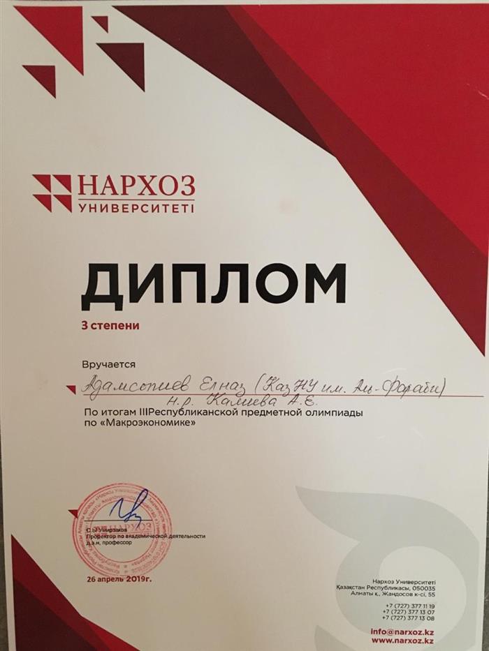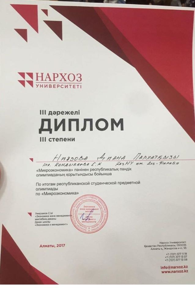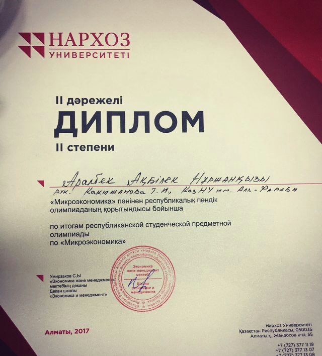 6) Студент 2 курса Аралбек Ақбілек получила диплом 2 степени на Предметной республиканской олимпиаде НАРХОЗ по дисциплине «Микроэкономика» (2017) |