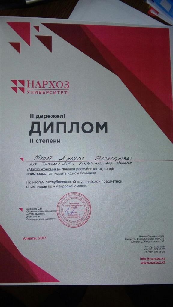 7) Студент 3 курса Мұрат Динара получила диплом 2 степени на Предметной республиканской олимпиаде НАРХОЗ по дисциплине «Макроэкономика» (2017) |