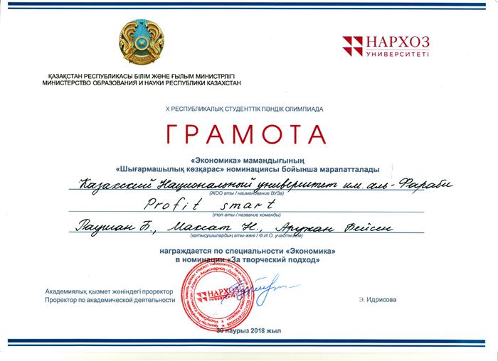 1) Команда Profit Smart, состоящая из студентов 3 курса специальности Экономика Байшокан Раушан, Нуртаза Максат, Бейсен Аружан, награждена грамотой Х республиканской студенческой предметной олимпиады в номинации "За творческий подход" (2018) |