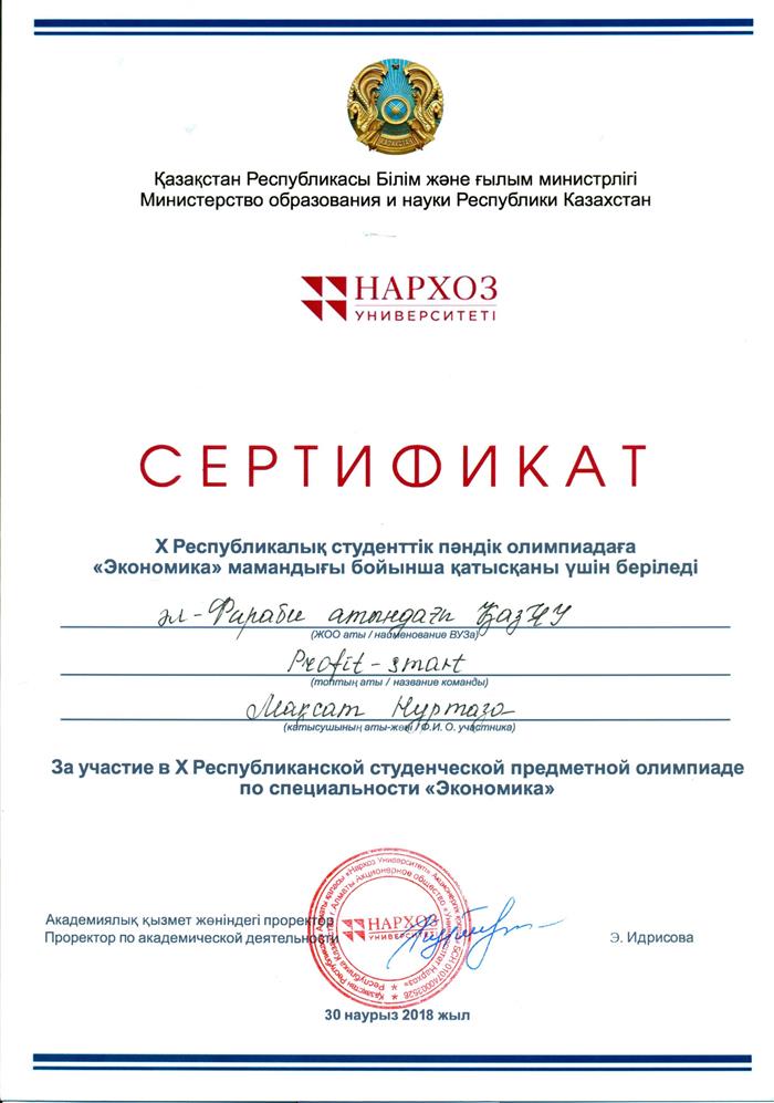 3) Cтудент 3 курса специальности Экономика Максат Нуртаза занял 2 место в Х республиканской студенческой предметной олимпиаде (2018) |