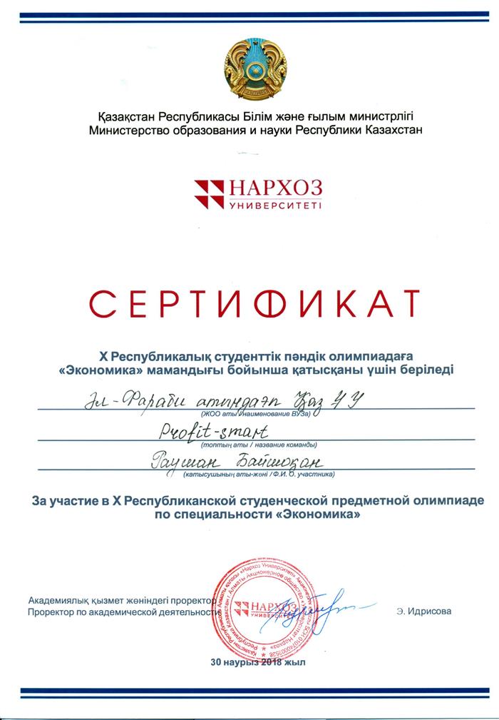 4) Cтудент 3 курса специальности Экономика Раушан Байшокан заняла 2 место в Х республиканской студенческой предметной олимпиаде (2018) |