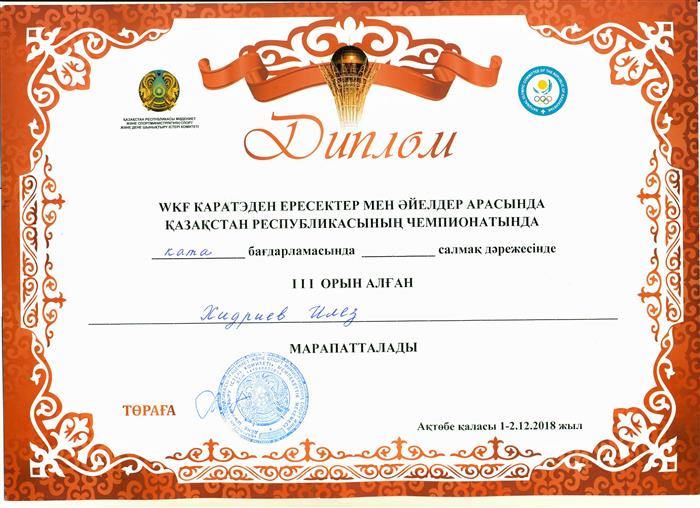 Студент 1 курса специальности "Экономика" Хидриев Илез занял третье место по программе ката на чемпионате Республики Казахстан по каратэ |