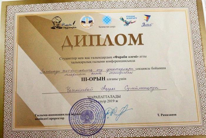 По итогам Международной научной конференции студентов и молодых ученых «Фараби Әлемі», которая проходила 8-11 апреля 2019 года дипломами были награждены: I степени - Абенова Айнур II степени - Мәлік Зарина, Тлетай Еркежан III степени - Ақатқызы Аружан, Оразақын Замира, Үргенішбай Ақерке |