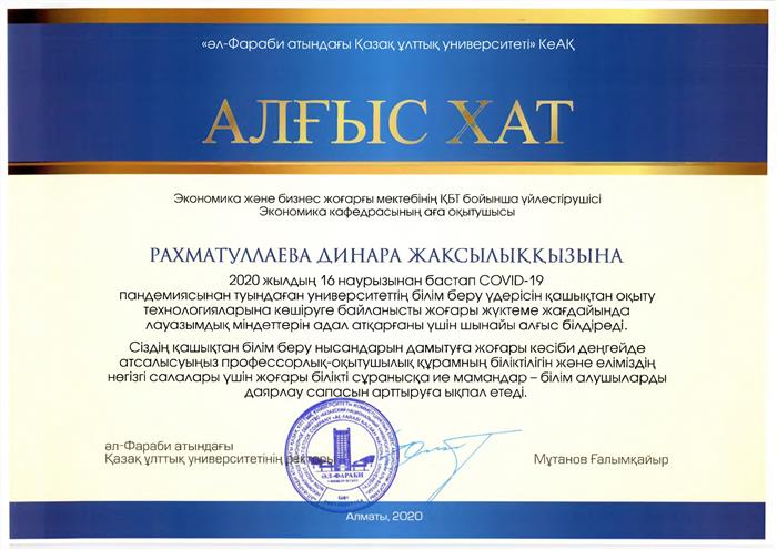 Координатор по ДОТ Высшей школы экономики и бизнеса, старший преподаватель кафедры Экономика Рахматуллаева Динара Жаксылыковна получила благодарственное письмо за добросовестное выполнение обязанностей в условиях высокой загруженности в связи с переводом учебного процесса вуза на дистанционные технологии обучения с 16 марта 2020 года в связи с пандемией COVID-19. |