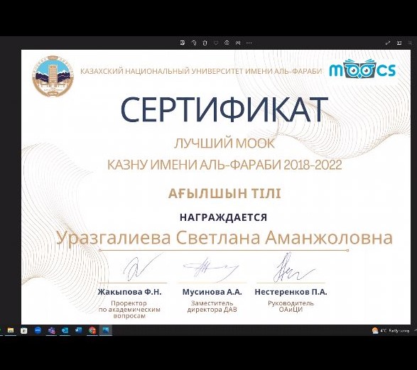 Старшие преподаватели кафедры иностранных языков: доцент, к.ф.н Мулдагалиева А.А., Джанузакова А. А, Режеп А. С., Гайипова Г.А., Уразгалиева С.А. были награждены сертификатами и благодарственными письмами руководством КазНУ им. Аль-Фараби и ДОТ за разработку МООК: Ағылшын тілі для студентов 1 курса бакалавриата казахского отделения. |