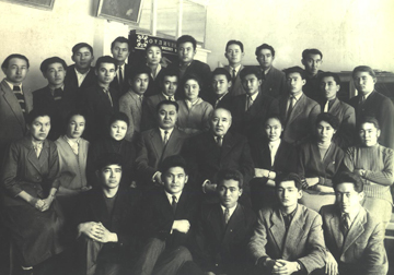 Студенты и преподаватели филологического факультета КазГУ. В центре - писатель, академик АН КазССР, Лауреат государственной премии СССР М.О.Ауэзов и доктор филологических наук, профессор З.К.Кабдолов, 60-е гг.