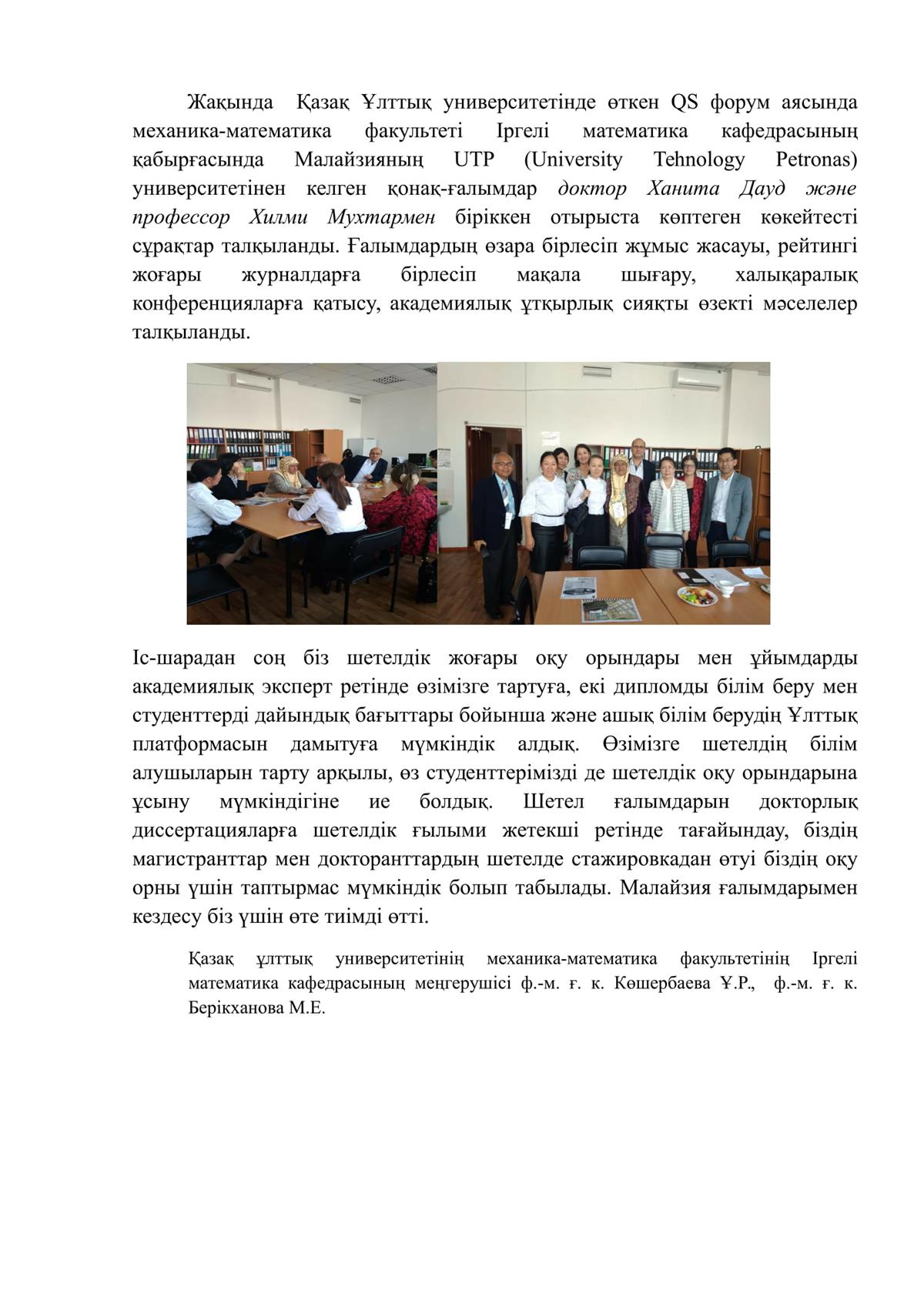 На семинар приехали ученые из разных регионов республики и делились своими работами. В конце семинара состоялось расширенное заседание кафедры фундаментальной математики.Проректор КазНУ по научному и инновационному развитию, академик Национальной академии наук Республики Казахстан Рамазанов Тлеккабыл Сабитович поздравил прфессора Схова М.Б. с серебряной медалью «Аль-Фараби». На этот юбилей прибыл директор Института теоретической математики и научных вычислений, доктор физико-математических наук, профессор кафедры фундаментальной и прикладной математики Евразийского национального университета им. Л.Н. Гумилева Нурлан Темиргалиев, глава делегации Западно-Казахстанской области, секретарь Западно-Казахстанского областного маслихата. Малик Иманкулович, Заместитель Председателя Правления Лондонской Алматинской Страховой Компании, Бекешев Ануар Токенулы, «Казахстанское Актуарное Общество» и глвав «Национального кредитного бюро» начальник управления развития Иманбердиев Догдыбек.