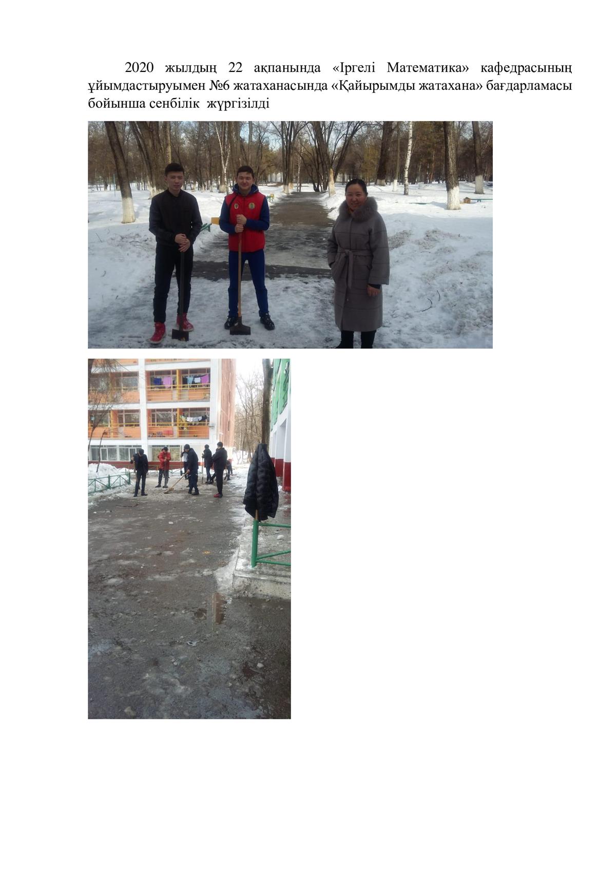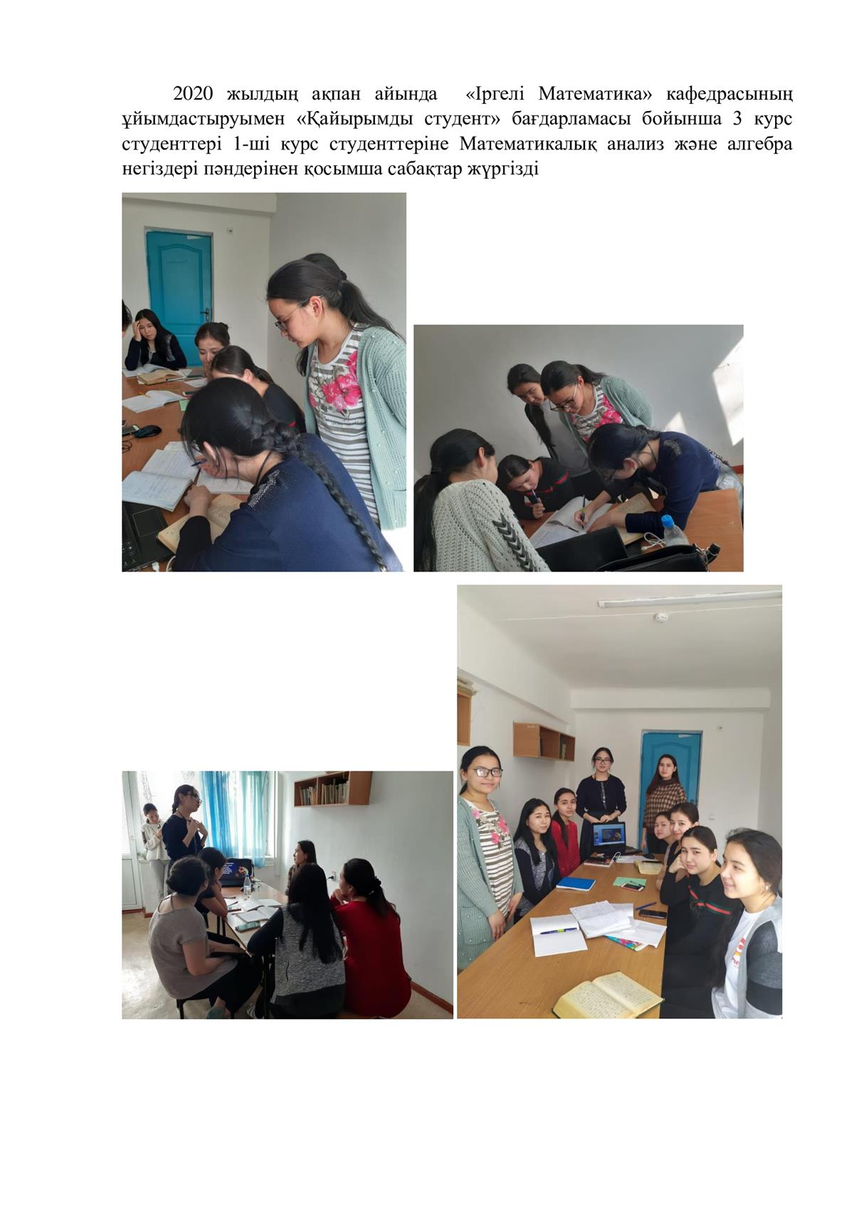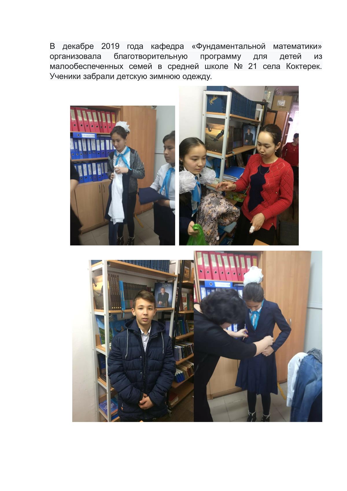 В декабре 2019 года кафедра «Фундаментальной математики» организовала благотворительную программу для детей из малообеспеченных семей в средней школе № 21 села Коктерек. Ученики забрали детскую зимнюю одежду.