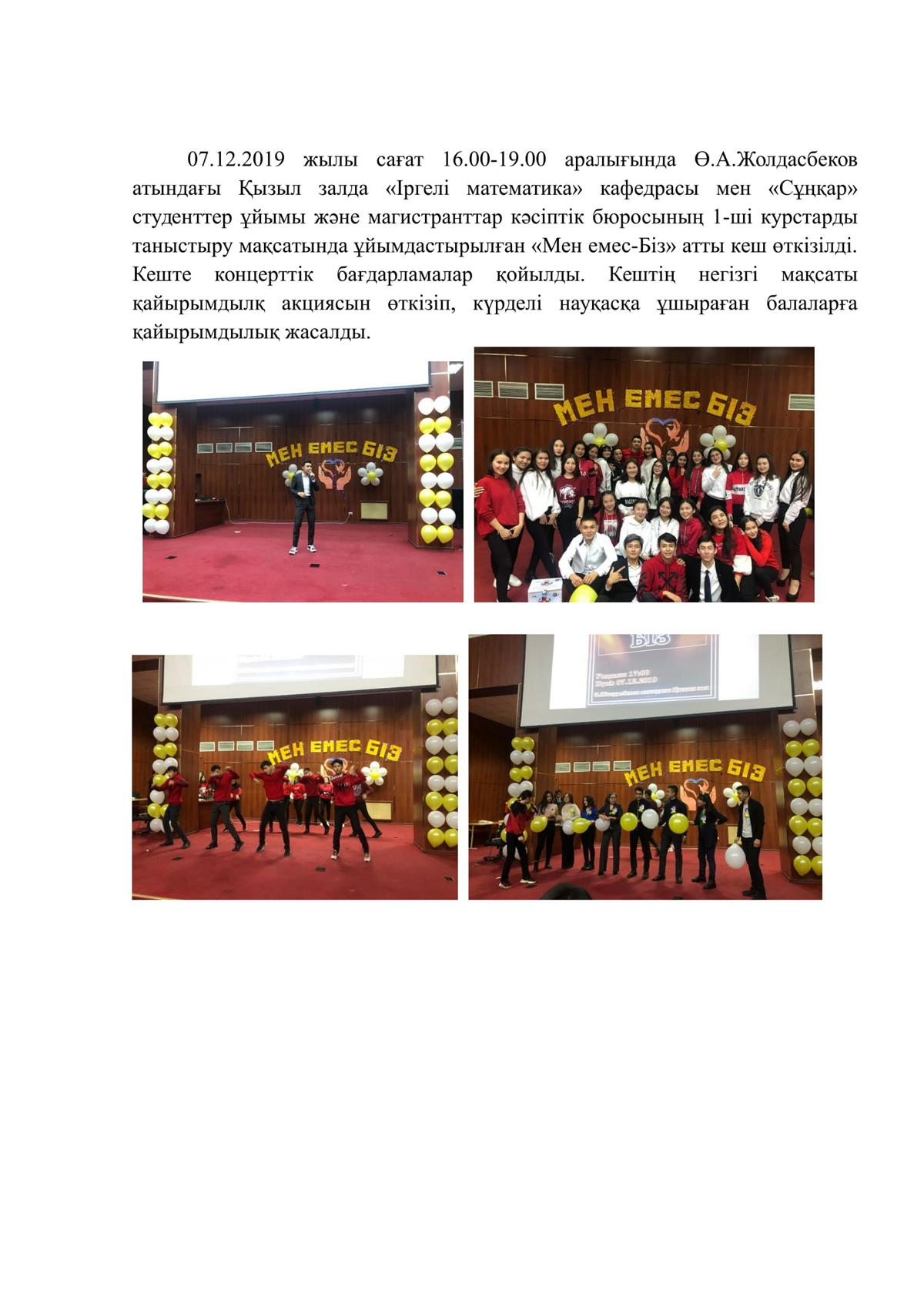 07.12.2019 с 16.00 до 19.00 в Красном зале имени О.А. Джолдасбекова состоялась вечеринка «Не мы», организованная с целью представления 1-го курса кафедры фундаментальной математики и студенческой организации «Сункар» и профессионального бюро магистрантов. Концертные программы были представлены на вечеринке. Главной целью вечеринки было благотворительное мероприятие, на которое были пожертвованы дети с тяжелым заболеванием.