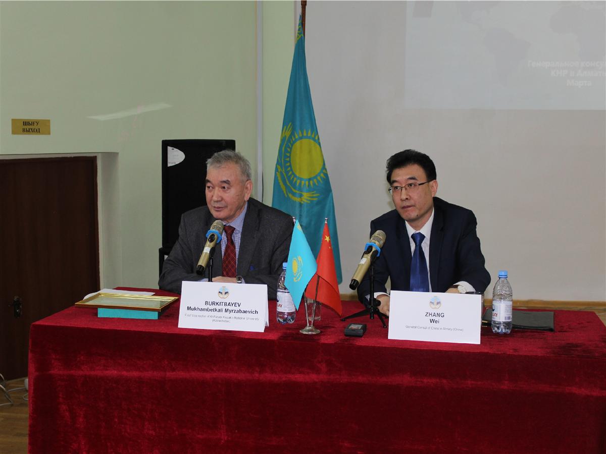 14 марта в 10:00 - 12:00 на факультете востоковедения КазНу им.аль-Фараби состоялась лекция Ген.консула КНР в Алматы господина Чжан Вэя на тему "Новые форматы казахстанско-китайских отношений".