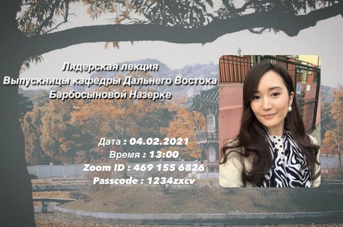 4 февраля 2021 года на онлайн-платформе ZOOM под руководством эдвайзера 1 курса Ким Э.В., пройдёт Лидерская лекция на тему «Деятельность переводчика корейского языка во время пандемии COVID-19» с выпускницей 2018 года КазНУ им. Аль-Фараби Барбосыновой Назерке. В ней приняли участие студенты отделения Корееведения кафедры Дальнего Востока.