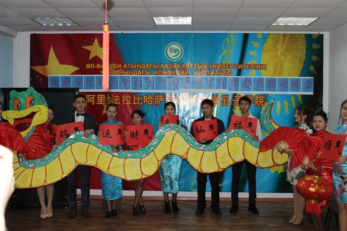 8 февраля 2013 года в 16.30 в Институте Конфуция, при организации Института Конфуция и кафедры китаеведения, состоялось торжественное мероприятие посвященное китайскому празднику «Весны». Гостями вечера были Ген.консул КНР в г. Алматы г-жа Ду Дэвэнь, вице-консул г-н Гао Чэнь, директор Китайского банка в Казахстане г-н Тянь Вэй, Ген.директор ТОО «КННК» г-н Цао Яминь, декан факультета востоковедения КазУМОиМЯ им. Аблай хана Ужкенов Е., заведующий кафедрой китайской филологии и перевода КазУМОиМЯ им. Аблай хана Калибекулы Т. Данное мероптриятие позволило студентами кафедры китаеведения и гостям поближе познакомиться с китайской традицией встречи Нового года по восточному календарю.