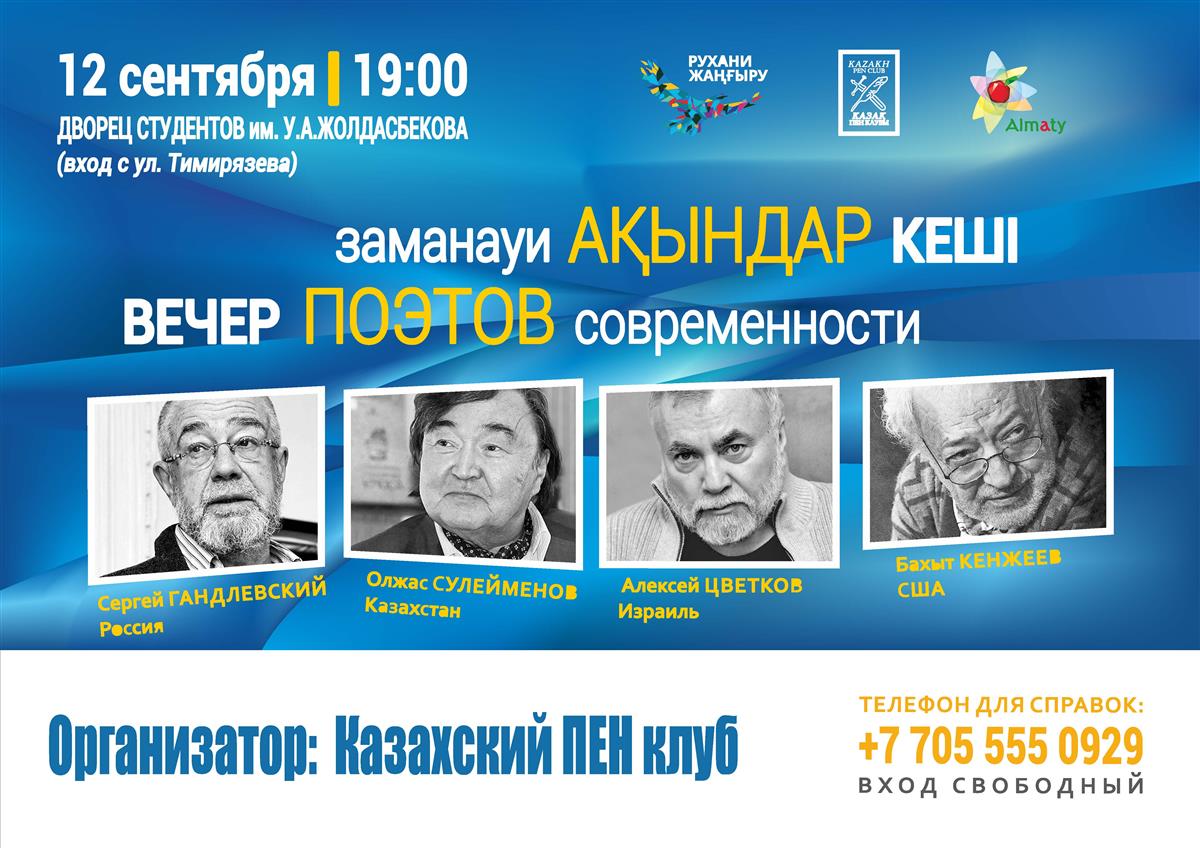12 сентября в 19.00 часов во Дворце студентов имени У. Джолдасбекова состоится вечер поэтов современности.