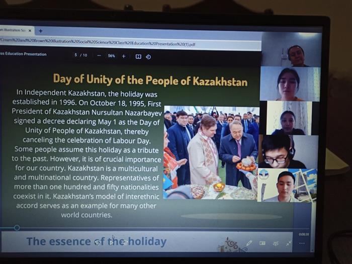 29 апреля 2021 года старшие преподаватели кафедры иностранных языков факультета филологии и мировых языков Казахского национального университета имени аль-Фараби Халенова А.Р., Алиярова Л.М., провели онлайн-мероприятие на тему «День единства народов Казахстана». 1 мая в Казахстане отмечается один из самых добрых и ярких праздников - День единства народов Казахстана. дружба, взаимопонимание и согласие, которые так необходимы для мирной жизни в стране, где проживает более 150 наций и национальностей. В большой семье Казахстана есть казахи, узбеки, русские, украинцы, немцы, корейцы, уйгуры, киргизы, китайцы, Евреи, армяне, грузины и многие-многие другие национальности. Каждый из этих народов по-своему уникален, но вместе на территории нашей республики они - один дружный народ. И в этом смысл Первомайского праздника. На филологическом факультете в форме презентации была представлена красочная информация об истории, традициях, культуре и быте народов республики. бунтарство, формирование духовно-нравственных качеств, гражданских и человеческих отношений друг к другу, а также умение жить в дружбе, любви и согласии в нашем многонациональном Казахстане